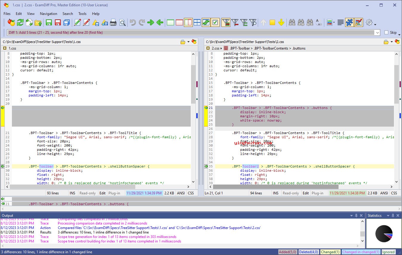 ExamDiff Pro将其操作记录到输出窗口,默认情况下, 位于屏幕底部。您可以使用控制按钮隐藏或最小化输出窗口 或使用视图控制其可见性|显示输出菜单命令。