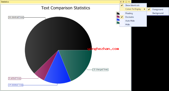 ExamDiff Pro在独自的窗口中显示比较统计图表,默认情况下在输出窗口的右侧。 您可以使用统计窗口右上角的控制按钮隐藏、最小化或浮动统计窗口,或使用显示统计窗口命令控制其可见性。