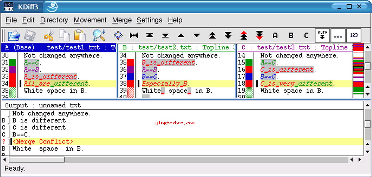 KDiff 3可用于合并两个或三个输入文件,尽量多地融合。结果显示在一个可编辑窗口中几乎所有冲突都能通过点击鼠标来解决:选择按钮A/B/C从按钮栏中选择应使用的源。您也可以选择多个源。由于此输出窗口是就算是需要进一步修正的冲突,也可以在这里解决,需要另一个工具。