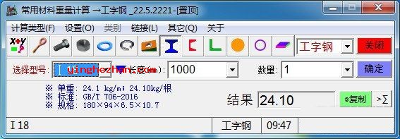 本材料重量计算器支持计算式、地脚螺栓、六角螺栓、六角螺母、垫圈、弹簧垫圈、方斜垫、工字钢、槽钢、角钢、圆钢、钢管、钢板等材料的重量。