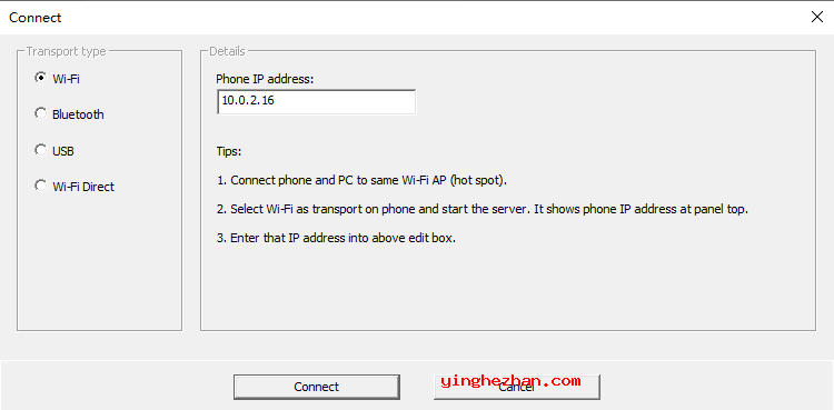 5、在连接对话框中,选择Wi-Fi作为传输并输入电话IP地址。